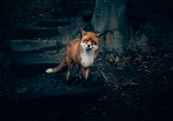 Une rencontre avec un petit renard curieux. Le renard regarde droit dans l'objectif.