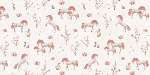 Un motif enchanteur avec des licornes gracieuses, des branches en fleurs et de douces fleurs. Les teintes roses romantiques et les illustrations délicates créent une atmosphère magique et rêveuse, parfaite pour ajouter une touche fantastique à n'importe quel espace.