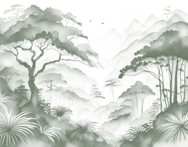 Cette peinture capture une vaste vallée montagneuse brumeuse avec des lignes délicates à l'encre. De grands arbres caractéristiques et une végétation luxuriante créent des couches de profondeur, tandis que des nuances subtiles de gris donnent au paysage une apparence onirique et paisible.