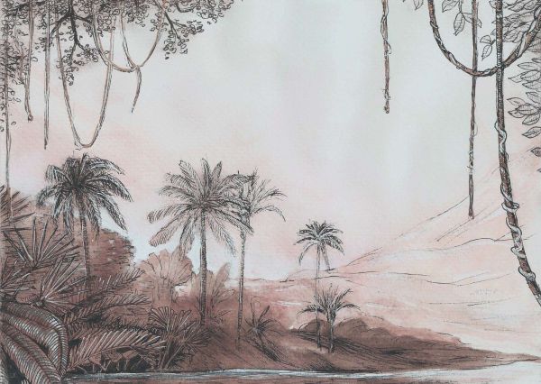 Un paysage tropical poétique avec des palmiers et des plantes luxuriantes, peint dans des tons roses doux et des couleurs terre chaudes. La combinaison de lignes d'encre et d'aquarelle crée une apparence légère et sereine.