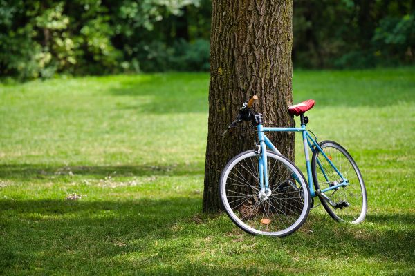 Un vélo garé contre un arbre dans un parc. Appliquez-le sur un mur de la chambre à coucher.