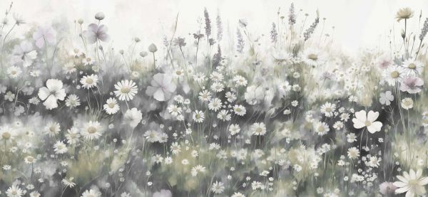 Une prairie de fleurs naturelle dans des teintes vert olive avec des fleurs délicates blanches et crème. Les effets aquarelle créent une ambiance apaisante et botanique, parfaite pour un intérieur frais et harmonieux.