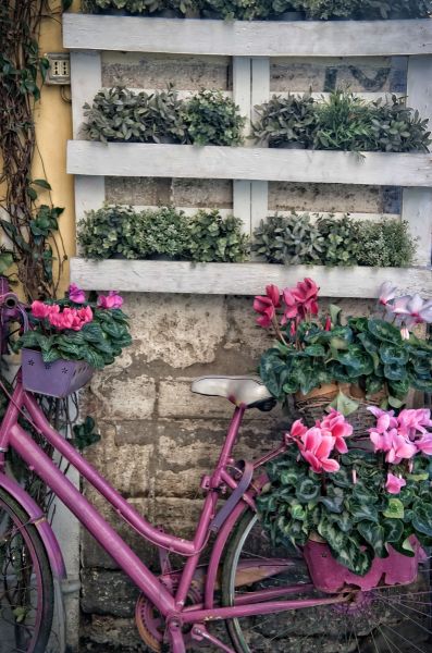 Portrait d'une bicyclette violette avec des boîtes de fleurs colorées.