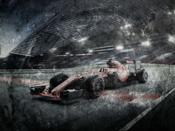 Une voiture de course vintage dans un vieux stade sur Papier peint photo. Combinez ce papier peint par exemple dans la chambre d'enfants et créez une pièce cool.
