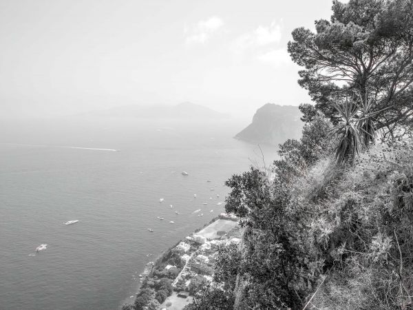 La vue depuis un endroit de l'île de Capri. La photo est en noir et blanc.
