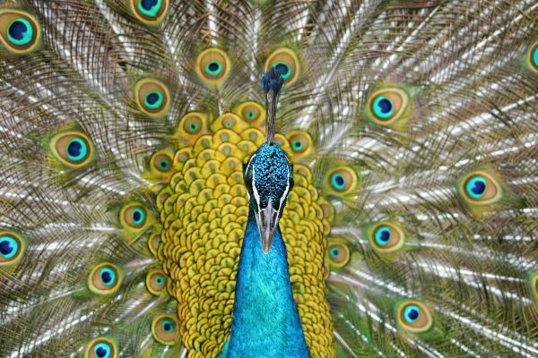 Gros plan de la vue de face d'un paon. Les belles couleurs jaunes et bleues ajoutent encore plus d'atmosphère à la maison.