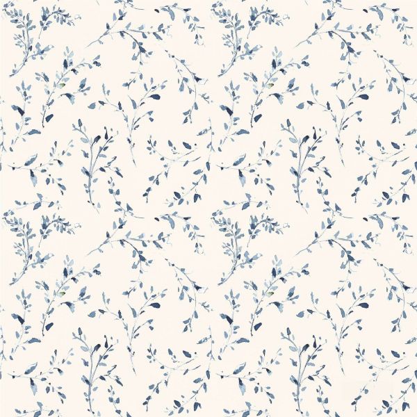 Motif répétitif élégant de brindilles gracieuses avec des feuilles bleues dans un style aquarelle sur un fond clair. Le design dégage calme, simplicité et raffinement.